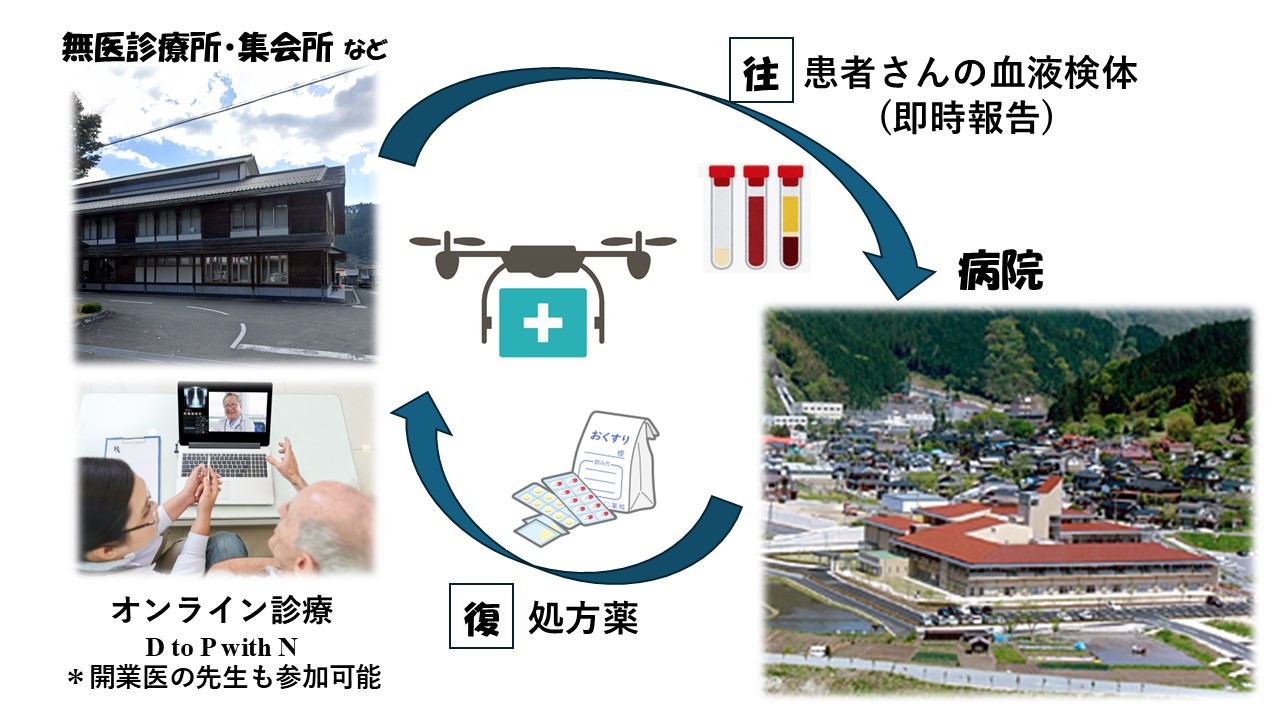 山の中の自宅近くの診療所(医者の居ない看護師さんだけの居る診療所)で、患者さんがオンライン通信を利用していつものかかりつけの先生(病院の先生、開業医の先生)との間で「オンライン診療」を受けるとき、看護師さんがオンライン通信機器の操作を手助けをしてくれる。そして、オンライン診療中に先生からの指示で「血液の検査」が出れば、隣に座っている看護師さんが採血して診療所からドローンで病院に血液検体を飛ばす(往路)。血液検査だけではなく、心音・呼吸音、心電図、血圧等の検査データも送れる。さらに看護師さんに技術を修得してもらえば超音波検査だってオンラインで可能になります。そして、しばらくして検査結果が出れば、即座にオンラインで患者さんに知らされると同時に、先生がその結果を見て適切な薬剤・薬量を処方する。薬は復路のドローンに搭載して病院から患者さんの待つ診療所に届けられる(高梁市国民健康保険成羽病院・真壁院長のアイディアより)。そのような仕組みがあれば、患者さんは毎回遠く離れた診療所や病院に行かなくても、自宅の近くの診療所(看護師さんだけの診療所)で、待っている間に検査結果やお薬を受けとることができる。電車やバスの便の乏しい中山間部では、タクシー利用を余儀なくされ、通院の交通費だけでも、5000円、10,000円は優にかかってしまう。中山間部の多くの高齢者は国民健康保健の加入者だったため、老後は基礎年金(最高でも月額68,000円程度)しか収入がなく、医療にかかること自体を諦めてしまう場合もあると思われます。山間へき地に住んでいるために、医療アクセスにる不公平が生じているのです。