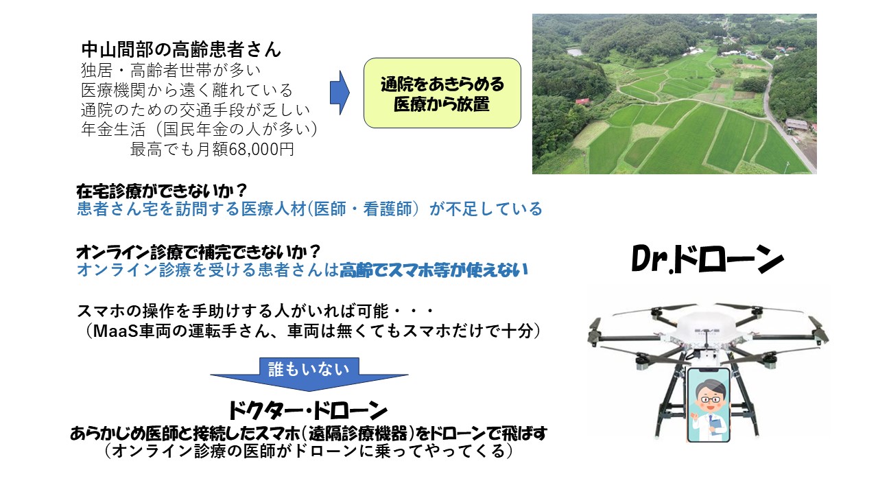 元来、新しもの好きであることには変わりないのですが、中山間部の高齢者の医療アクセスが大変困難な様子を見て、ドローンを活用することを思い立ちました。